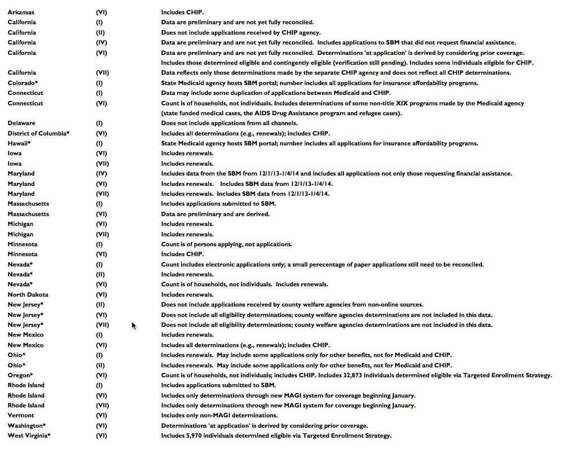 If you look at the footnotes on Page 6 of the December CMS Report, you can see that according to the official CMS report there are only two states in which the report includes SBM data for Medicaid and CHIP Determinations (columns VI and VII): Maryland and Massachusetts. There are no other states listed as inlcuding SBM data for those columns. A couple of other states (California, Rhode Island) do mention including applications from the SBM's, but not the actual determinations, which are what we're talking about here. The reports for October and November only include SBM determinations from MD and MA as well: