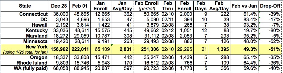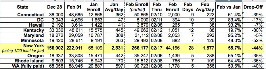 As I noted the other day, this isn't very useful since both Nevada and Vermont are clearly messed up, and New York doesn't make much sense judging by the official HHS numbers for each month. I'd love it if February has actually seen a massive spike in enrollments, but that doesn't make sense compared with the other states--and as I later clarified, it isn't the case.