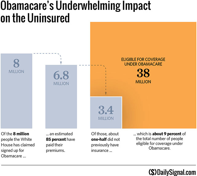Assuming the most positive estimates—that 85 percent of the 8 million enrollees have paid their premiums and 43 percent had coverage before—the newly insured would number only about 3.9 million. By this time, CBO had projected 19 million would have been removed from the ranks of the uninsured, and CMS predicted 26 million.