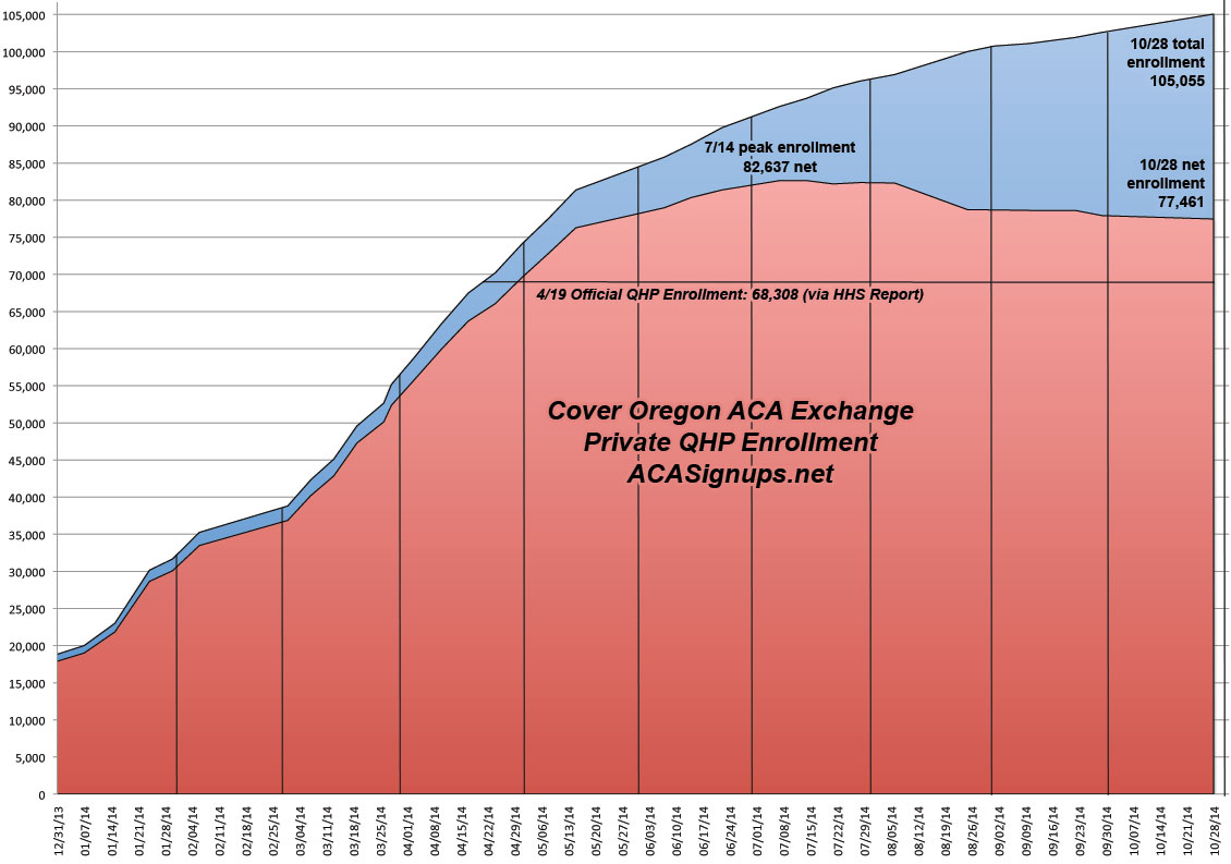 Well, the total enrollment figure has gone up another 2,459 over 29 days, or 84 per day. This is a far cry from the 200+/day they were averaging throughout the summer, but it's still pretty darned impressive given that all of the states are winding down in anticipation of the new 2015 rates and Oregon, along with Nevada, is in the process of making the move to HC.gov.
