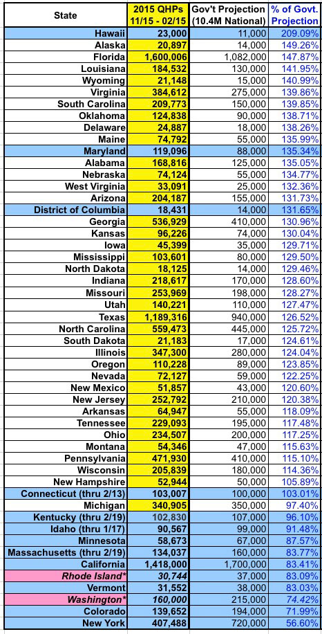 2015 QHP Enrollment Period vs. "Official" HHS Dept./State Exchange Projections: Hawaii is the biggest surprise here. They performed pathetically last year, even considering their small population and smaller uninsured rate...but unlike Maryland or Massachusetts, their technical woes didn't lead to a wholesale overhaul (or abandoning ship for HC.gov like Oregon and Nevada did). I don't know what anyone else was expecting out of the Aloha state, but I don't think anyone expected them to more than double the official target. Similarly, Alaska wasn't expected to do well since they're one of the few states where exchange policy premium rates really did skyrocket, due to the nature of their market. However, for sheer numbers, Florida is a jaw-dropper: Over 1.6 million enrollments...11% more than 2014 king California, even though CA has nearly double the population. And remember, with an extra week of potential "In Line by Midnight" additions, Florida could potentially break 1.7 million in the end. The bottom of the list is again composed of the same batch of state-based exchanges. Again, the missing data and other caveats apply, with one exception: New York. For whatever reason, the NY State of Health really thought they could nearly double last year's haul with 720K QHPs this time around; obviously that didn't happen. California is also looking to miss their target of 1.7 million, badly, even though that's only 21% higher than last year's tally. Hopefully the extra week of "In Line" additions will reduce the gap. On the up side, while Minnesota also missed their target, they came much closer than expected, and might even squeak by during the overtime period.