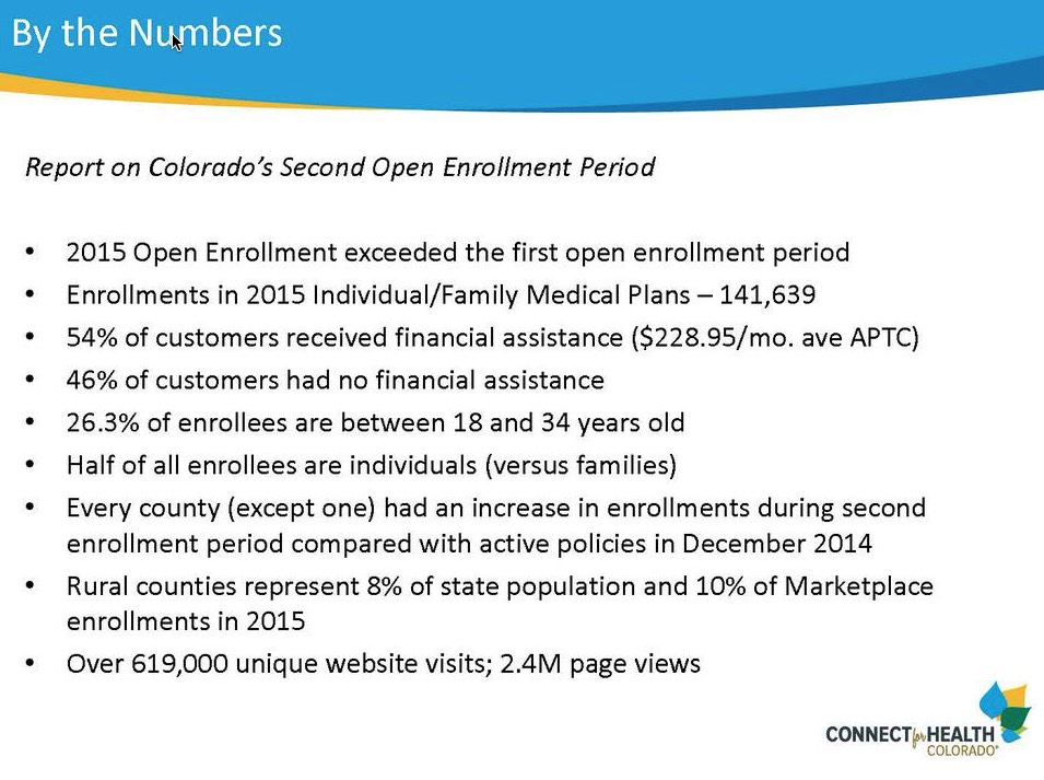 The Colorado ACA exchange has just released their latest official enrollment report, and while it's chock full of useful data, it's also bit hard to read (physically...it's a low-res version, will swap it out with a higher-res PDF once they post it), and the numbers also require a bit of parsing...and are a bit confusing.