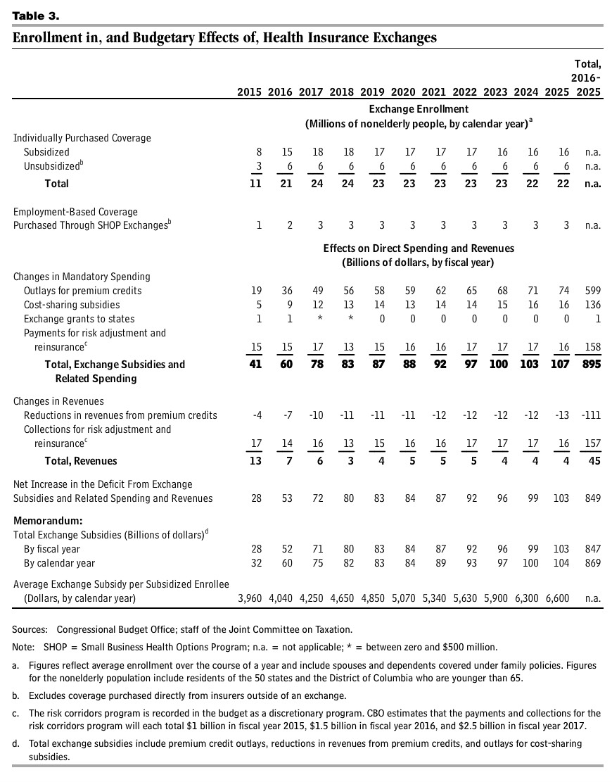 This means two things: First, the CBO is assuming that the Supreme Court will not kill off the federal exchange tax credits (if that happens, exchange enrollment would plummet to perhaps 3-4 million at most). I don't know if this is a sign of confidence on their part, or if they're simply not allowed to make assumptions about legal changes in the future--they probably have to make their projections based on the law as it stands today, and will only make such an adjustment in July if the SCOTUS does drop the bomb in June.