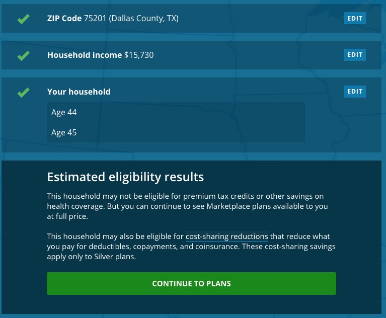 Oh, crap! This couple expects their household income to be literally at the very upper edge of the FPL. Since 100% FPL doesn't qualify adults w/no kids for Medicaid, and Texas hasn't expanded it, they're left out in the cold, with NO healthcare coverage options whatsoever.
