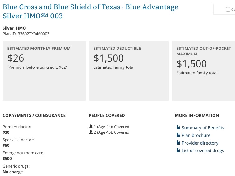 There we go. They would have to pay $26/month for the premiums ($312/year), but their deductible/maximum out of pocket cost (co-pays, etc) is only $1,500. In short, the maximum this could possibly cost this couple would be $1,812.