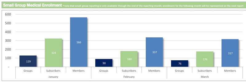 • Finally, they provide what appears to be SHOP (small business) enrollments...except that the numbers here don't in any way match up with their prior report, in which they stated that SHOP enrollment stood at around 4,200 total covered lives. The current report makes it seem like the number is only 317 people (if the March "Members" figure is the one I'm looking for) or 1,222 (if I'm supposed to add all 3 months together). You can see the discrepancy below: