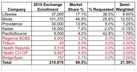 Hayes goes on to list the rough or exact enrollment numbers for all 10 companies, allowing me to whip up the following table, which gives a rough idea of the weighted average rate increases requested by the Oregon insurers: