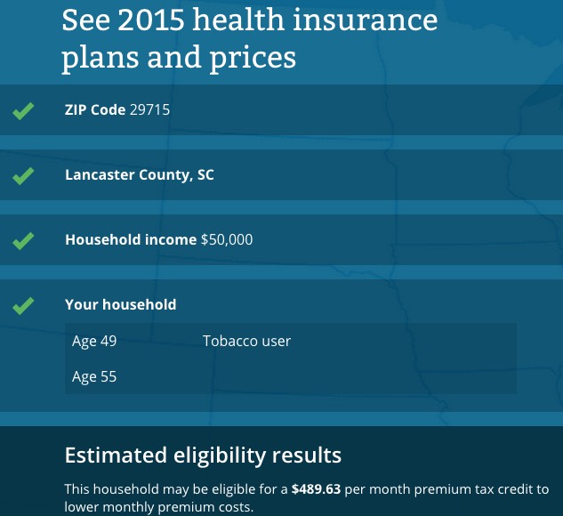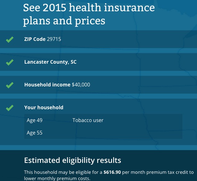 In fact, I went ahead and plugged in Mr. & Mrs. Lang's info into HealthCare.Gov. He says that he's 49 and his wife is 55. He's also a smoker (dunno if she is; I'll assume not). They live in Lancaster County, SC.