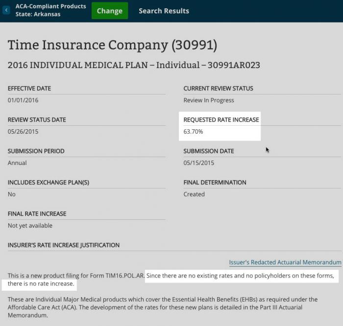 This is for off-exchange policies only, and Time doesn't appear to even be available on the Arkansas ACA exchange in 2015 (I checked in Little Rock, anyway; it's possible that they're available in some counties but not others?), so I'm assuming that they're brand-new to the state next year, and if so, that's fine.