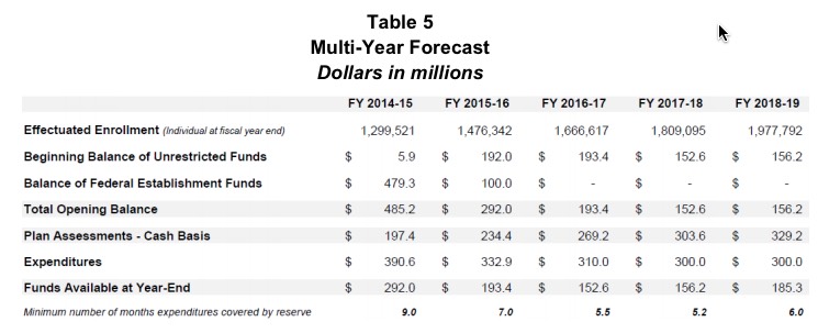 For another, as noted above (and as I noted just last week), CoveredCA has nearly $300 million in reserves, and expects to bring in around another $234 million via exchange enrollee fees ($13.95 per member per month, times an average of around 1.4 million effectuated enrollees per month).