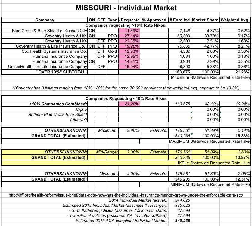 However, these companies combined only make up 163,000 enrollees...when Missouri's total individual market last year was around 344,000. Assuming that growth and grandfathered/transitional plans cancelled each other out (again, that's a big assumption), there should be something like 176,000 Missourians enrolled in individual, ACA-comliant policies via companies which are requesting rate hikes lower than 10%. This includes Cigna, Anthem BCBS and possibly other companies operating off-exchange only.