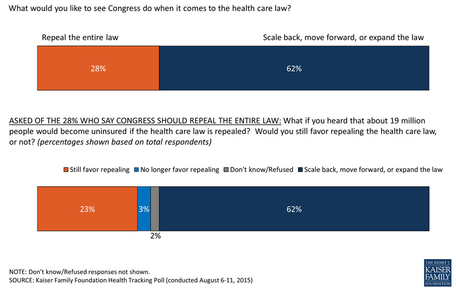 Although those who want the law repealed disagree about what Congress should do, they are unified in their unwavering desire for repeal. After being told that about 19 million people would become uninsured if the health care law were to be repealed, only 3 percent are swayed to say they no longer favor repealing the law.