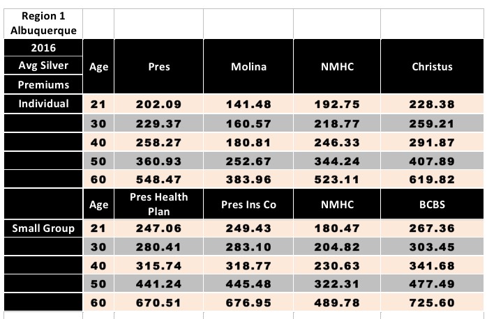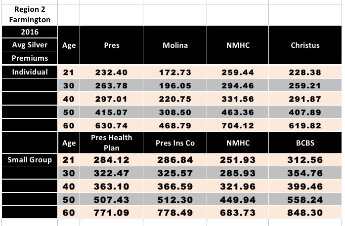 However, I am able to provide a sneak peak at average rates on the New Mexico individual and small group markets next year, for individual enrollees at 5 different ages, in all 5 different coverage regions: