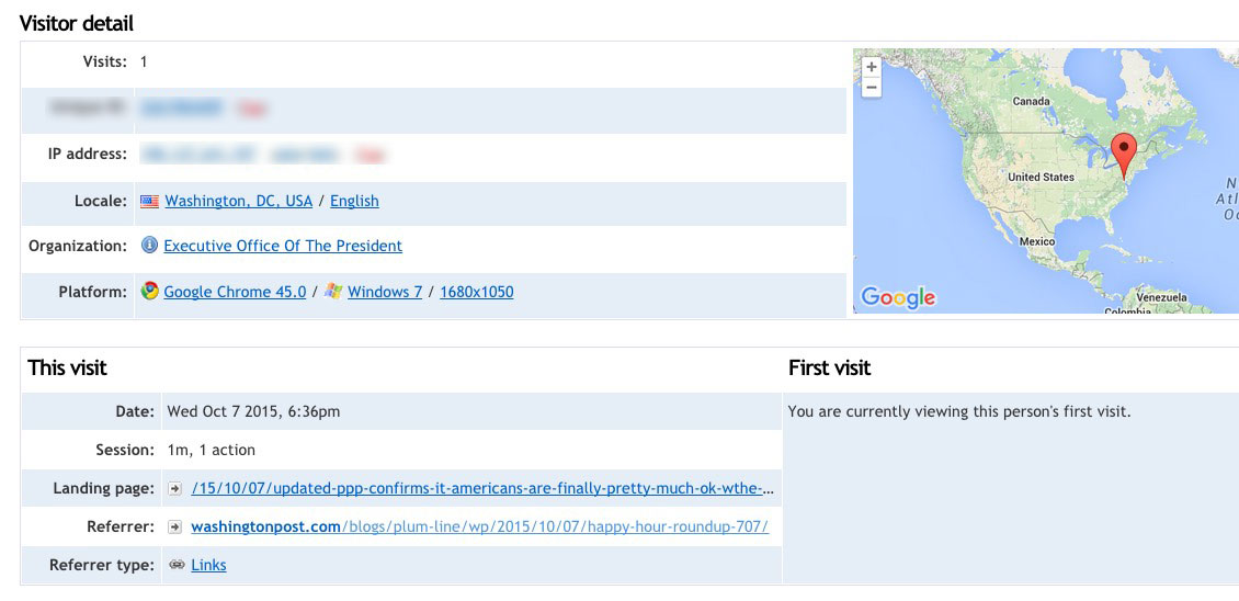 I've blurred the IP address given the circumstances, but as you can see, someone in the Oval Office (yes, it even includes the latitute & longitutde) visited this site at 6:36pm EST on Wednesday, 10/7/15. They were referred to the site from a Washington Post article by Greg Sargent and spent about 1 minute reading my blog post, using a Windows 7 machine running Google Chrome version 45.0, with a moniter resolution of 1680x1050.