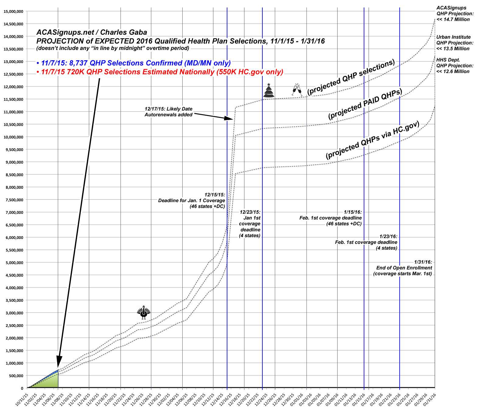 My initial rough projection assumed around 410K QHPs in the first week. However, I later realized that last year, HealthCare.Gov reported 462,000 QHP selections in the first week! Since HC.gov only enrolls about 75% of the national total (the rest are via the state-based exchanges), that actually translated into more like 600,000 nationally during the first week for 2015's open enrollment period.