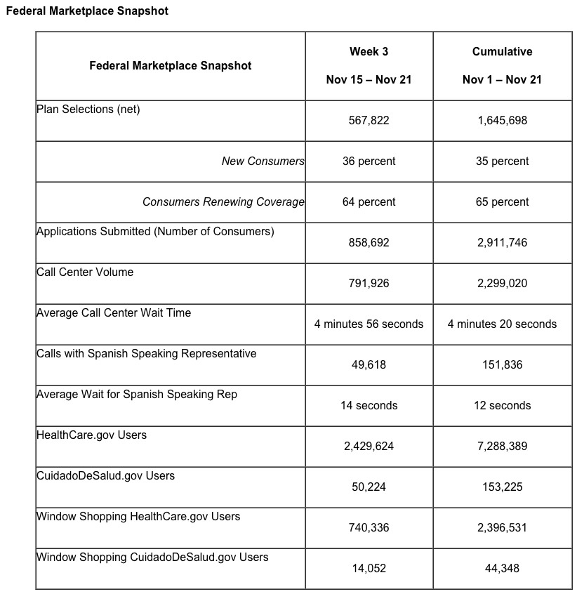 During the third week of Open Enrollment, consumers continued to explore their health insurance options by reaching out to a call center representative at 1-800-318-2596, attending enrollment events in their local communities, or visitingHealthCare.gov or CuidadoDeSalud.gov. There are about three weeks remaining ahead of the December 15 deadline.