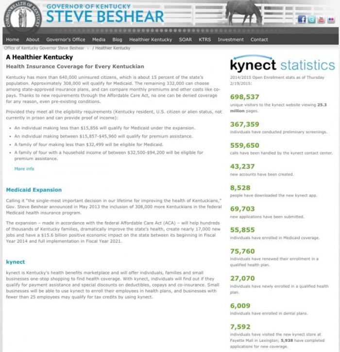 Here's what Democratic Kentucky Governor Steve Beshear's official "Healthier Kentucky" webpage looked like yesterday. Outdated, of course (no updates since the end of the 2015 Open Enrollment Period), but lots of data touting the thousands and thousands of people the Affordable Care Act (aka OBAMACARE, guys) has helped receive healthcare coverage via either private policies or Medicaid expansion: