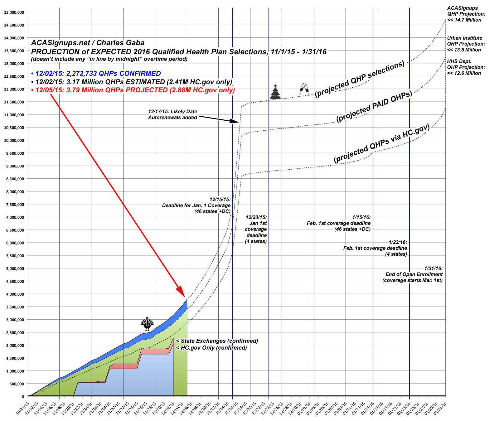 UPDATE 12/03/15: OK, strike that. This has been nagging at me all day. I'm bumping HC.gov Week Five projection up further to 840,000 for 11/29 - 12/05 (2.88 million cumulatively), or around 3.77 million nationally.