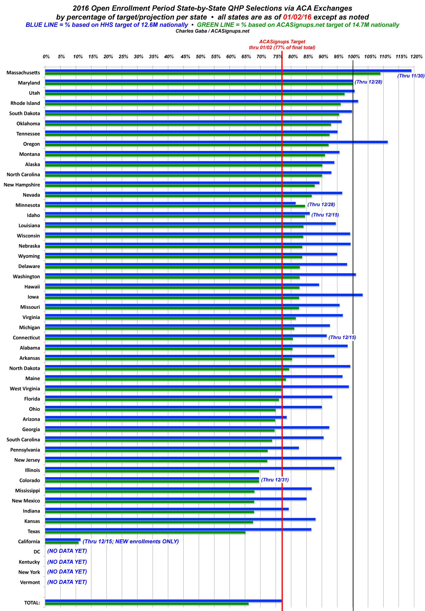 - The BLUE LINES represent the percentage of QHP selections each state had achieved as of January 2nd for most states compared to my best guess at their reasonable proportion of the 12.6 million people the HHS Dept. expects to select plans nationally. In some cases (California, Colorado, Connecticut, Idaho, Maryland, Minnesota and Vermont), I've used the official target number for that state, according to the exchange itself. For other states, I took a proportionate number based on the HHS Dept's 12.6 million total.