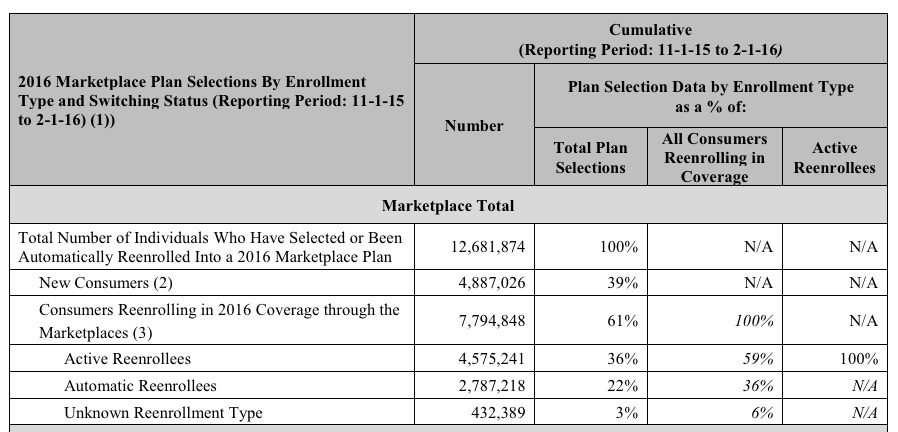 The report touts the increased percentage of active renewals (ie, people actually going to the exchange site and choosing their 2016 plan, whether renewing the existing one or switching to a different one. 59% of those who renewed their policies did so actively this year, which is an increase over 2015's 53%...but again, about 800,000 of those people had no choice but to "actively renew" (or drop off the exchanges entirely) since their Co-Ops closed up shop. Still, the more active re-enrollees, the better, even if they stick with the exact same policy as my family did for a third year in a row: