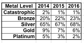 - METAL LEVELS: As you can see, each year, more and more people seem to be realizing that ultra-low-end (Catastrophic) and ultra-high-end (Platinum) plans aren't the wisest way to go, settling on the low- and mid-range (Bronze/Silver) options. My gut tells me that about 1/3 of those choosing Bronze plans would still be better off going with Silver, but the trend so far is actually fairly encouraging on this front: