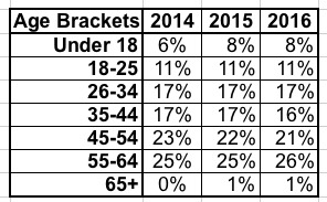 - As noted earlier, the age brackets have barely budged over all three years either: