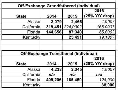 As you'll recall, until now I had data on "grandfathered" and "grandmothered" policy enrollment from 3 states: Alaska, Florida and Kentucky. However, even that limited data is kind of iffy, because most of it is from either 2014 or 2015, making it difficult to pin down the current numbers as of Spring 2016. Here's a summary of what I have so far: