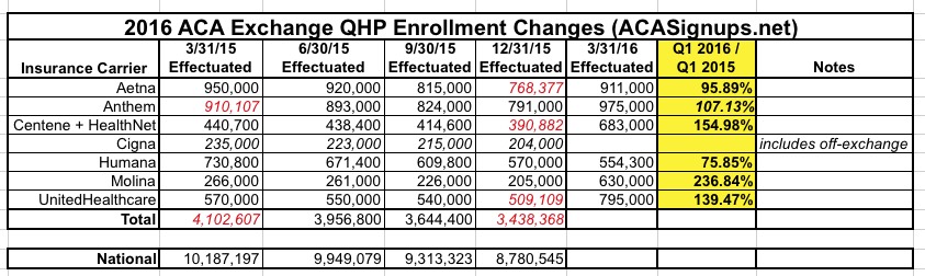 This is probably difficult to read, but the first column is the effectuated enrollment as of 3/31/16: 554.3K exchange-based; 208.7K off-exchange; and 112.7K non-ACA compatible (off-exchange). The second column is the average for the first quarter; the third is where things stood as of 1 year ago, followed by the net and percentage changes.