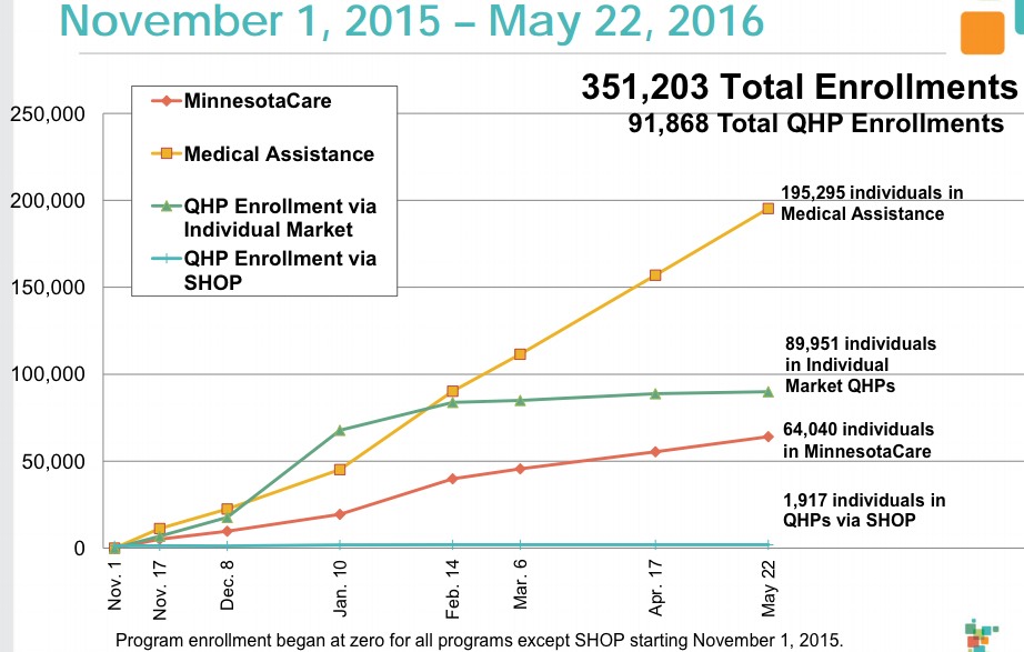 - 4/18/16 - 5/22/16: 91,868 QHPs cumulative since 11/01/15 (+1,172, or 33/day); 64,040 MNcare; 195,295 Medicaid
