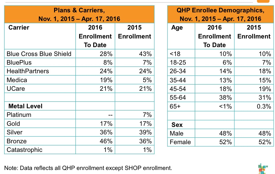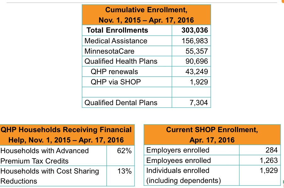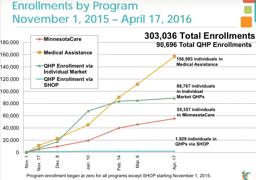 - 3/07/16 - 4/17/16: 90,696 QHPs Cumulative since 11/01/15 (+3,840, or 91/day); 55,357 MNcare; 156,983 Medicaid