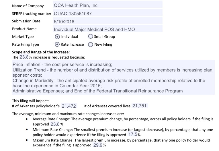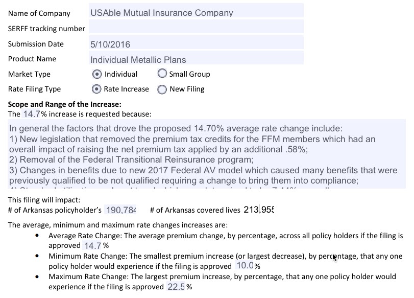 Arkansas was a little weird...while the rate filings for 5 carriers are listed over at RateReview.HealthCare.Gov, the carrier with the largest individual market share in the state, BCBS (aka "USAble Mutual") is nowhere to be seen (there's a sm. group listing for them, but not individual). However, when I went directly to the AR SERFF database, there they were--and it's listed specifically as "2017 Individual QHP Rates", so there's no question here about whether they plan on offering ACA-compliant policies in 2017.