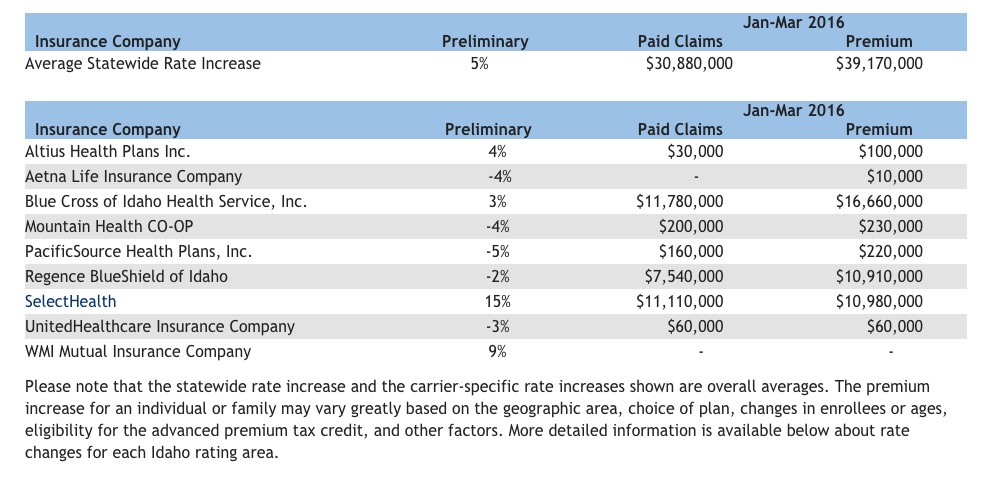 The Idaho insurance department website has made this really easy for me. Most states either don't provide the requested rate hikes at all (forcing me to track them down via a slew of SERFF filing forms) or, if they do provide the rate requests, they don't provide the actual enrollment numbers for each carrier, making it very difficult to run a weighted average.