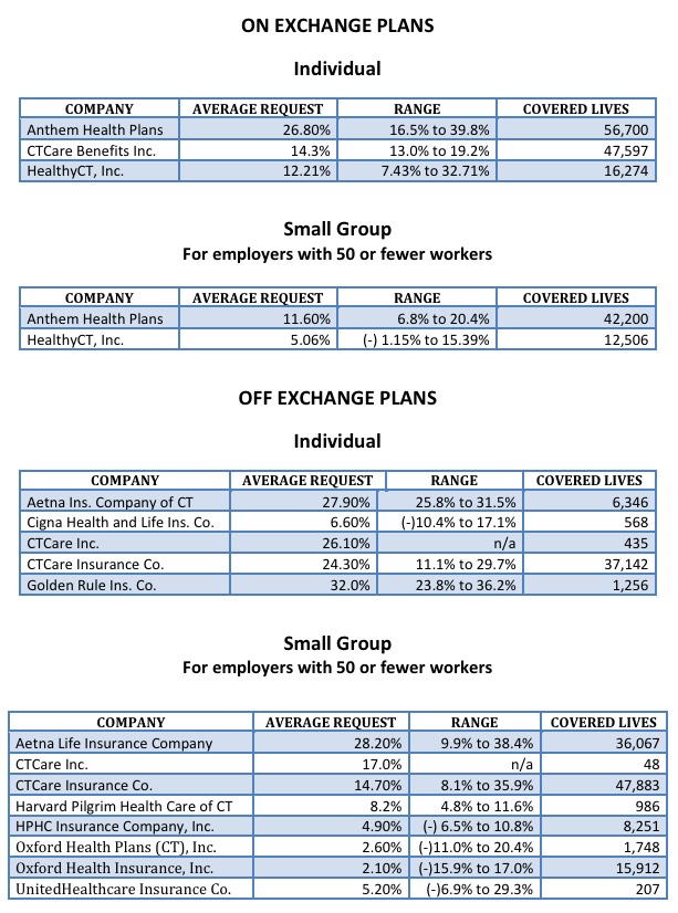 Thanks to commenter "Junaed S" who directed me towards this simple, cut 'n dry PDF from the Connecticut Dept. of Insurance detailing the requested rate hikes for the CT individual and small group markets for 2017: