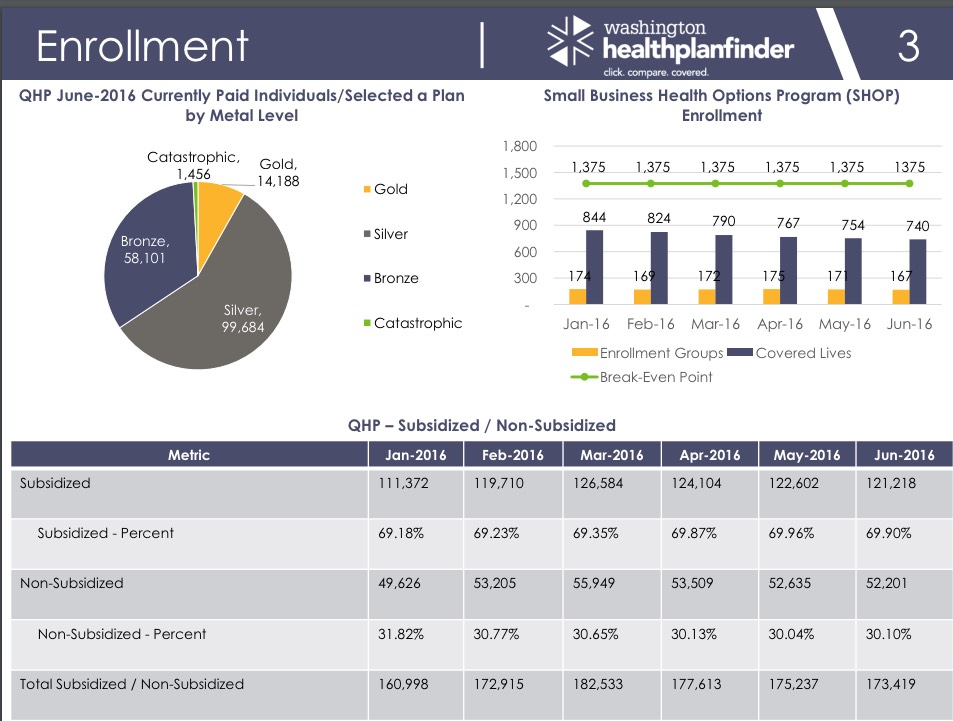 Now that the official ASPE Q1 2016 Effectuated Enrollment report is out, I can compare various state exchange reports against that to see how they're doing. In Washington State, 158,245 people were reported as being enrolled in active, effectuated exchange policies as of 3/31/16.