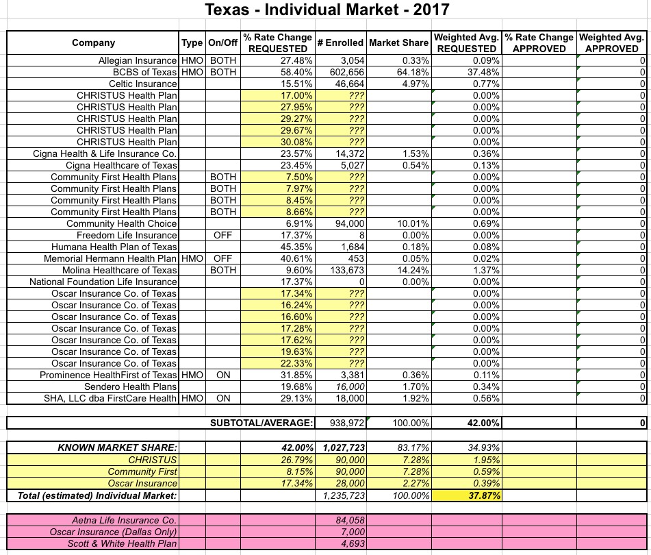 With that in mind, I've gone back and actually removed Aetna from a bunch of state spreadsheets to see what the hard impact is overall. In addition, I've also cleaned up the tables for some other states to remove smaller carriers who have announced that they're dropping out as well. For instance, in Michigan, Priority Health Insurance is out (but Priority Health HMO is still in). In New Mexico, Presbyterian is off the exchange. In Texas, Scott & White is out, and so on.