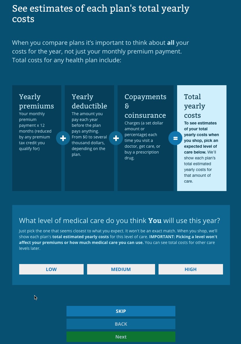 They've also added a new pop-up which lists the average premium and total costs for all plans by each metal level as a guide: