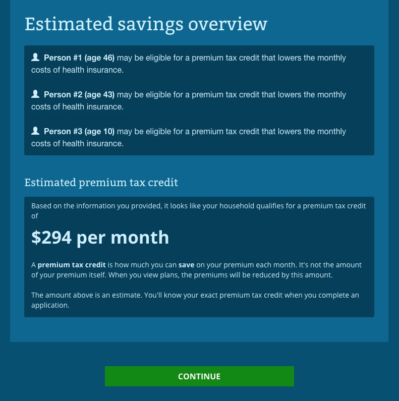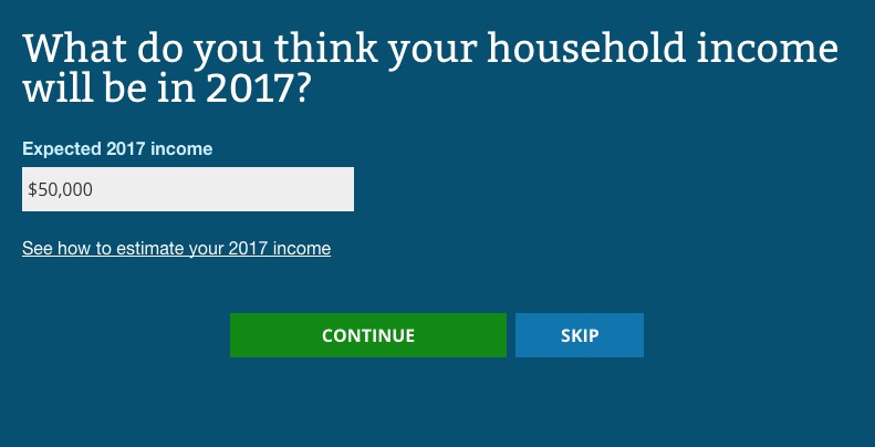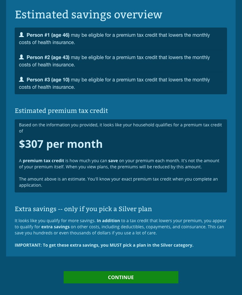 So far, I've been plugging in accurate data (my correct zip code and age). For the rest, I'm using test data. For instance, if your household income is under 250% of the Federal Poverty Line ($50,400 for a family of 3), in addition to the Advanced Premium Tax Credits (APTC), you also qualify for Cost Sharing Reduction (CSR) assistance...
