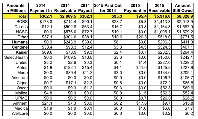 A table follows, listing every carrier across the country which owes money to or is owed money from the Risk Corridor program for 2015, as well as how much 2015 funding will be paid out to them to cover what's still owed for 2014. It's a long list, and some of the numbers are pretty big.
