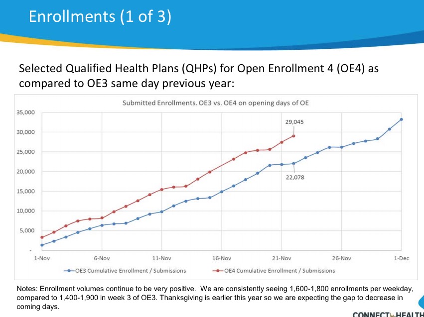 Today, the Connect for Health Colorado Finance & Operations Committee had a meeting with the following slideshow...showing that they're doing even better than that: 29,045 QHP selections in those same 22 days.