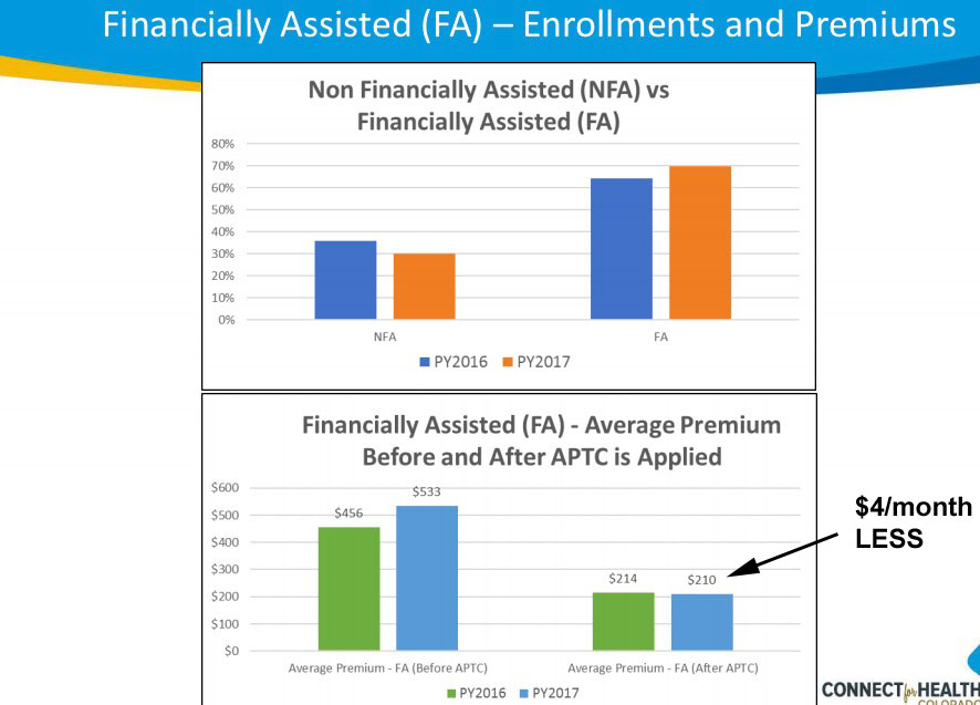 However, there's also another important tidbit here (last slide below): While the average unsubsidized premium rates for Colorado exchange enrollees officially went up 16.9%, the final premium cost to the enrollees is actually dropping by 1.9% (from $214/month to $210/month):