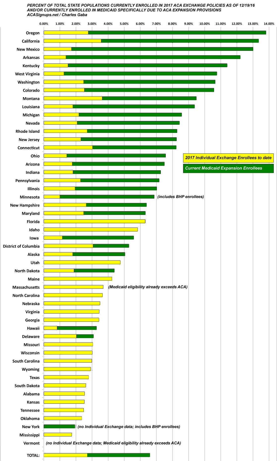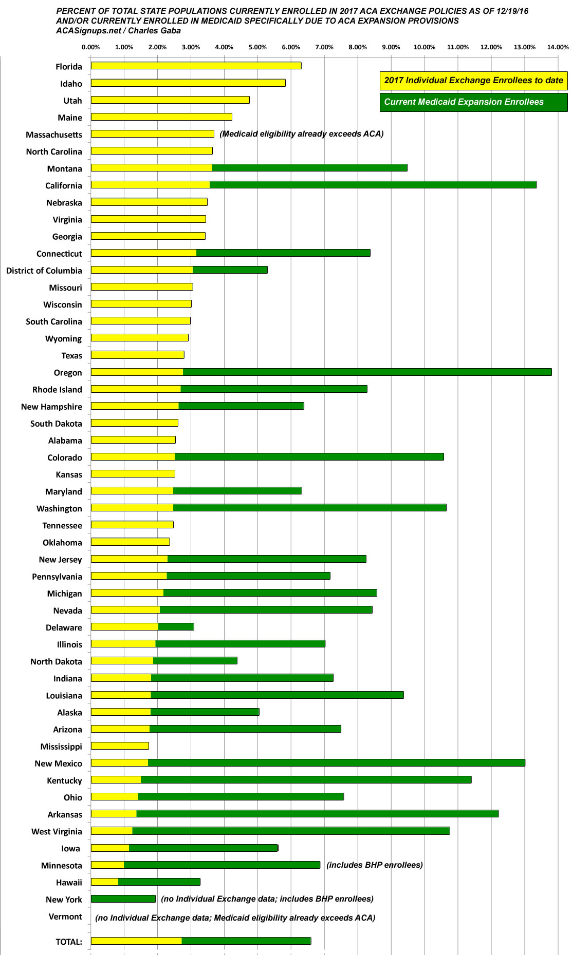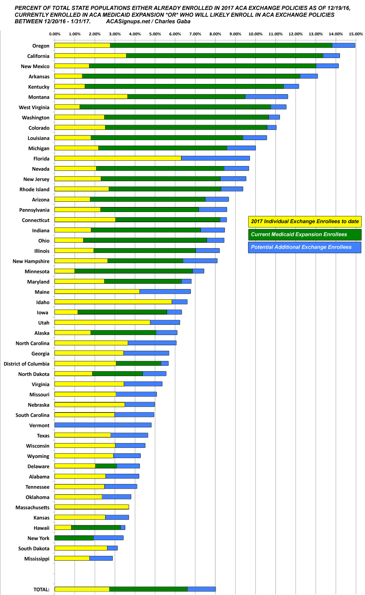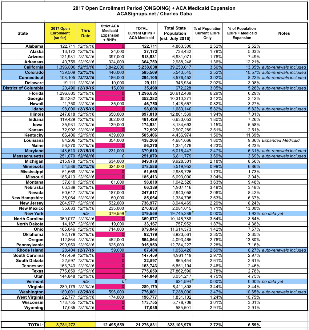 Therefore, I've compiled the following table which ranks each state by the percent of their total population who have been confirmed to have already selected a Qualified Health Plan (QHP) through the ACA exchange for 2017 as of the 12/19/16 deadline. I've also included another column, which add in the number of people enrolled in ACA Medicaid expansion.
