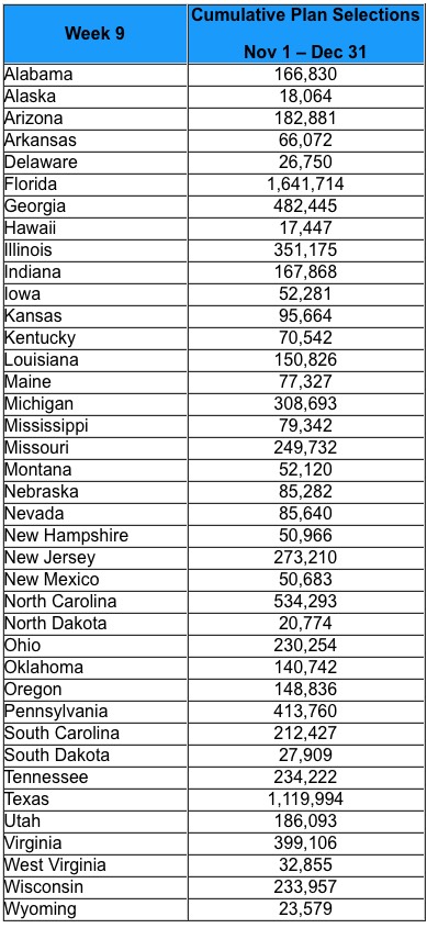 As in past years, enrollment weeks are measured Sunday through Saturday. Since this year Open Enrollment began on a Tuesday, the totals reported in this snapshot reflect two fewer days than last year’s Week 9 snapshot, yet still enrollment exceeds last year’s total.