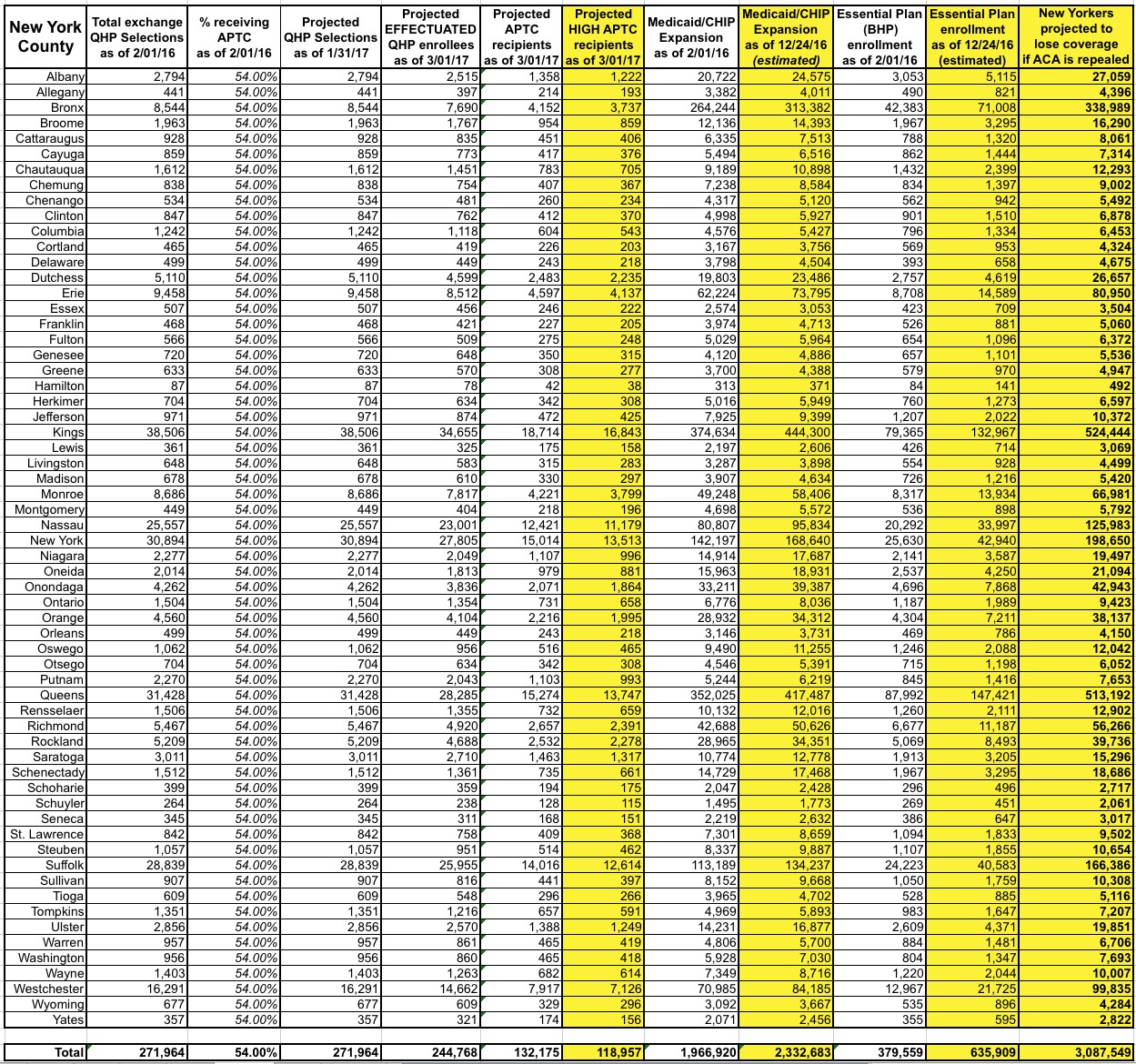 As it happens, the additional 206,000 BHP enrollees brings the grand total at risk of losing coverage right back up to...2.7 million after all, just as Gov. Cuomo's office estimated, although the exact breakout between counties and type of coverage differs a bit.