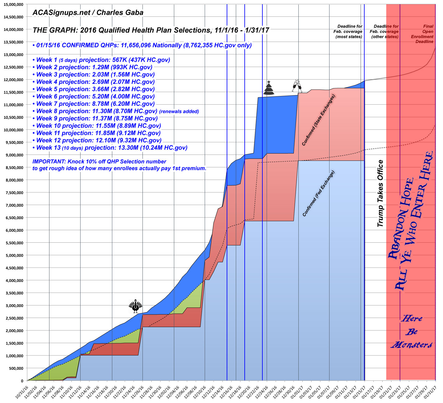 How will this impact the final, January 31st QHP selection total? Well, I've already dropped my projection from 13.8 million down to 13.3 million. It's possible that current push to repeal the ACA by the Republican Party, combined with Donald Trump actually taking office may cause a total enrollment collapse over the final 11 days...or it could cause a massive, panic scramble to sign up...or anywhere in between.