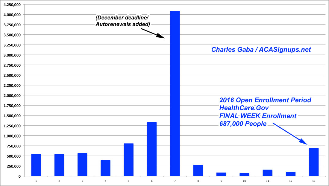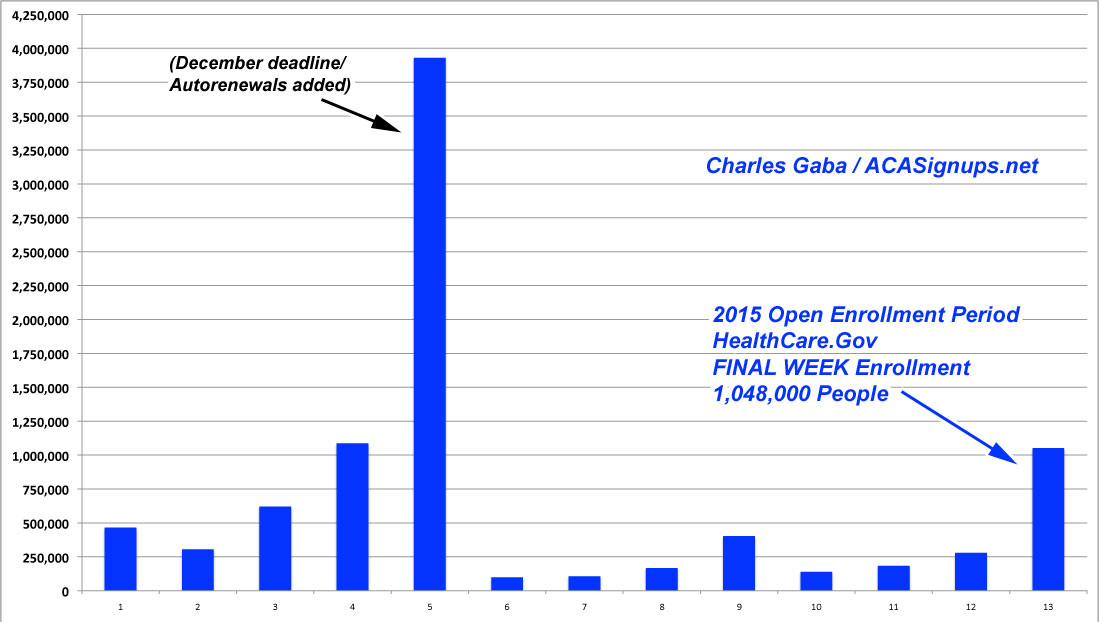 As you can see, in 2015, during the final week of Open Enrollment, over a million people signed up via HC.gov. Another 242,000 jumped in during the extra "overtime" week.