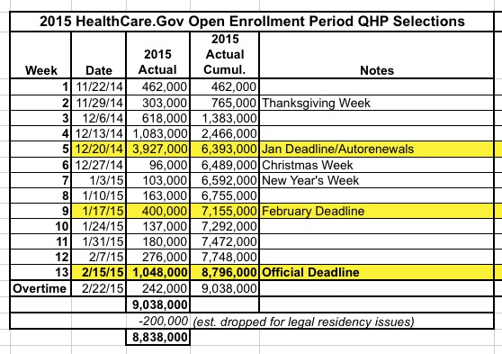 I can't really use the 2014 Open Enrollment Period to compare with for several reasons: For one thing, it lasted 6 full months instead of 3; the massive technical problems at launch meant that enrollments were artificially end-loaded; and there was a 2-week "overtime" period tacked onto that as well.
