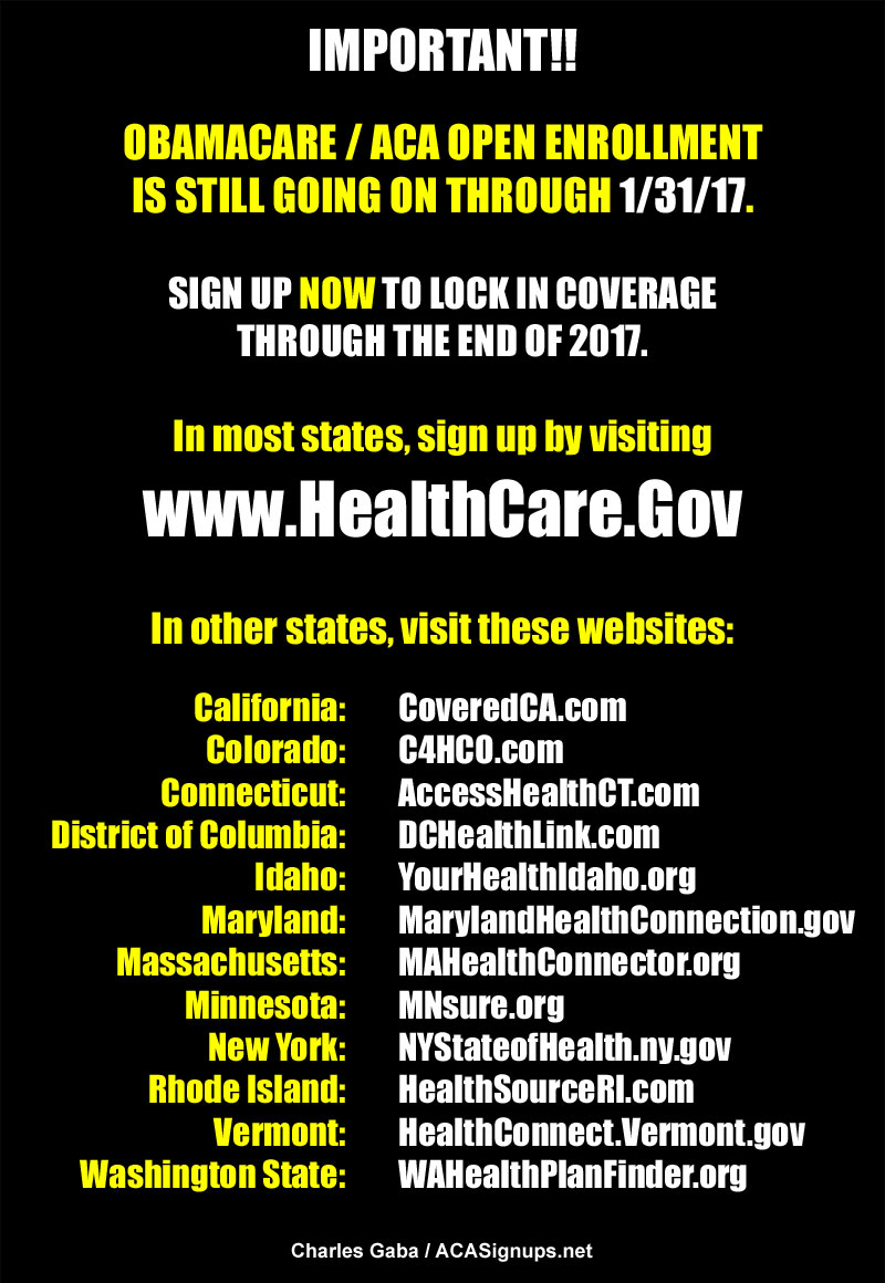 This may seem a little silly, but given the upcoming Open Enrollment deadline, the did-they-or-didn't-they confusion regarding the Trump administration's attempt to pull the final TV commercial/social media/phone/email notifications and the general insanity going on right now, I figured it might be helpful to provide direct links to the various ACA (Obamacare) websites for people to actually sign up for 2017 coverage.