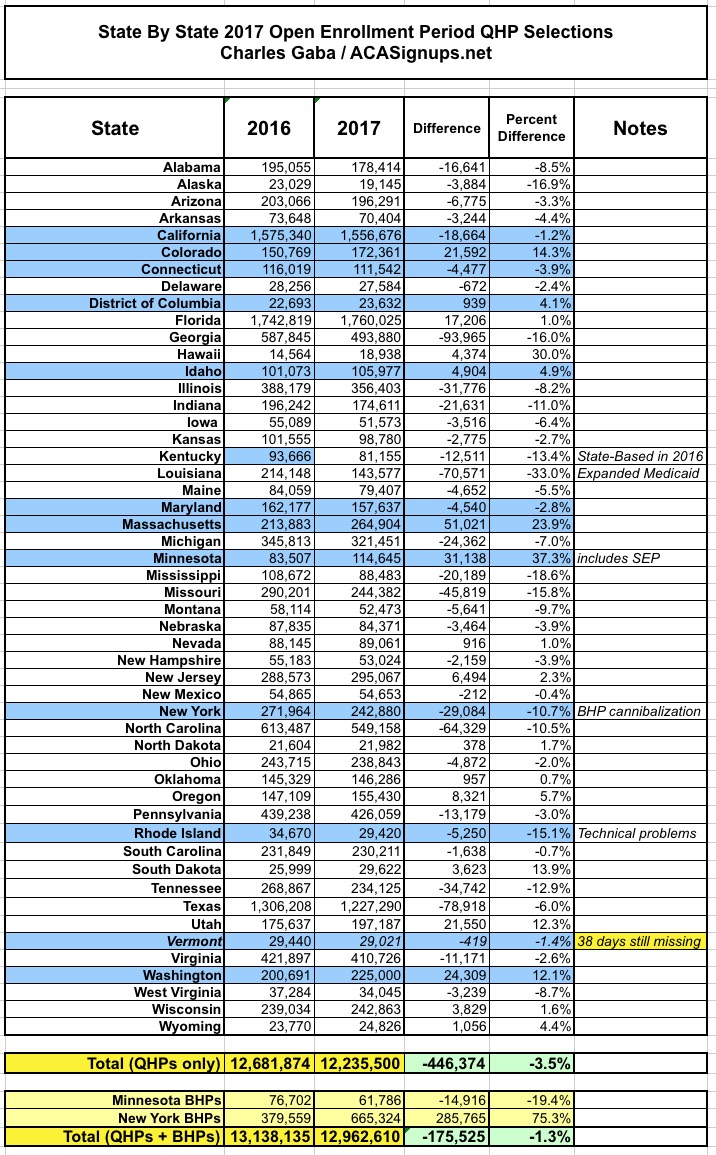 A few days ago I assumed the grand total would come in between 12.3 - 12.4 million, but I was misreading California's total based on their previous report which had made it look like they would break 1.6 million. Instead, they came in 44K below that mark, so the national total now stands at exactly 12,227,442 QHP selections, or 3.6% below 2016's final total. There's only 2 states missing data now: Minnesota and Vermont.
