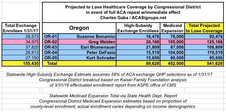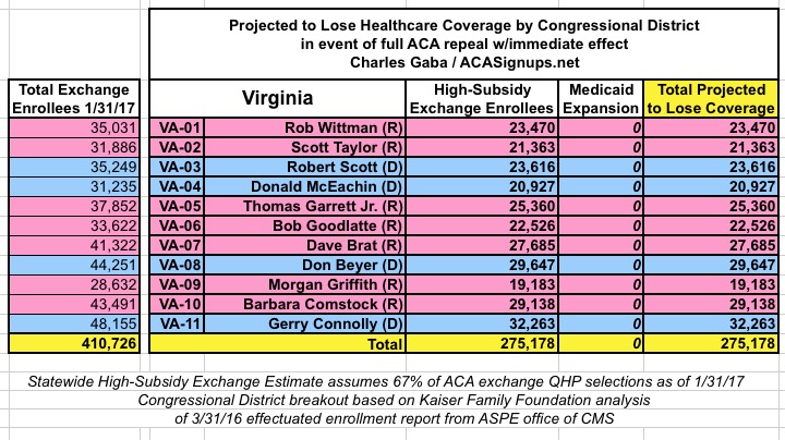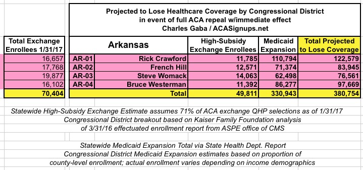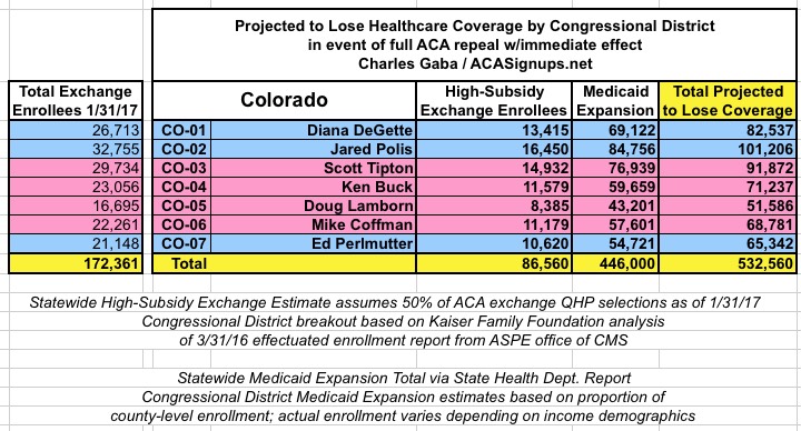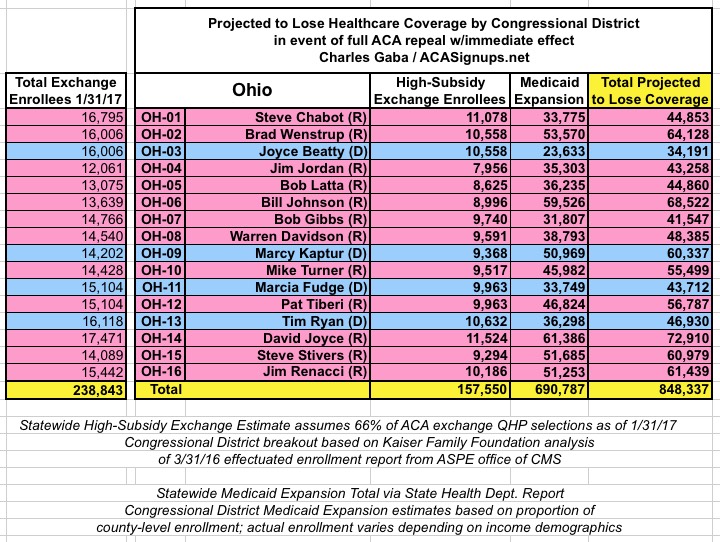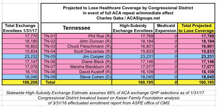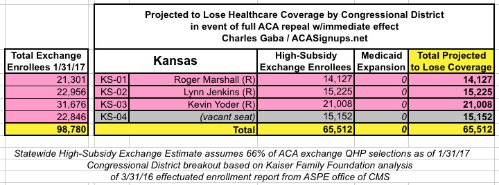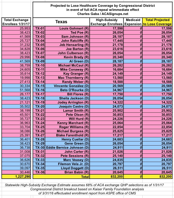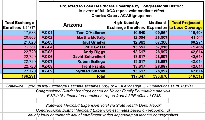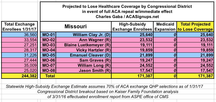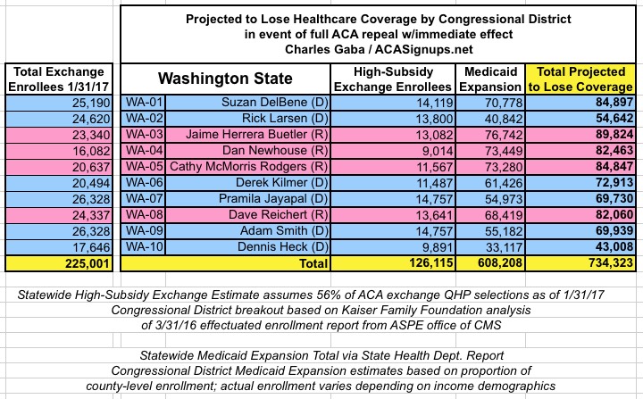 MAJOR UPDATE 3/22/17: As I've noted repeatedly, my estimates of how many people are at risk of losing their coverage has always been based on the assumption of full repeal with immediate effect and, most importantly, no replacement healthcare policy whatsoever. I had to do it this way at first because there was no Republican replacement plan available until a couple of weeks ago. Then, when the AHCA plan was released, I didn't have the time or expertise to properly overhaul my projections accordingly.