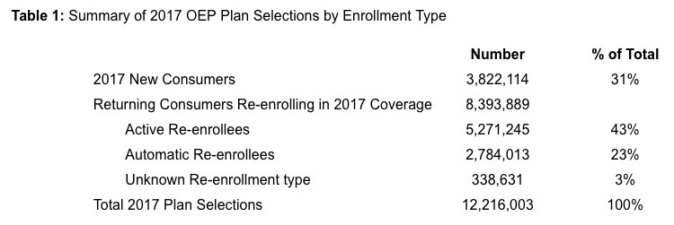 Well, 8.4 million 2016 enrollees ended up renewing/re-enrolling. This is actually very close to what I originally projected back in mid-October (8.5 million), but 700K lower than HHS was expecting (9.2 million). Unfortunately, only 3.8 million new enrollees signed up this year...well below both HHS and my expectations (4.6 million and 5.2 million respectively).